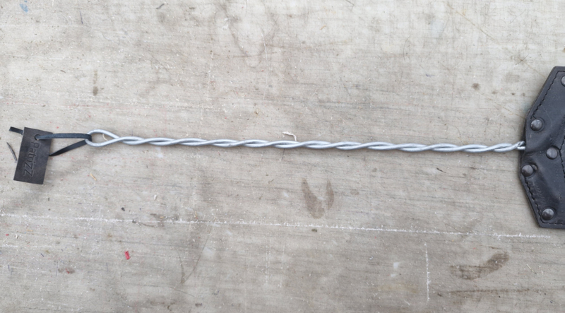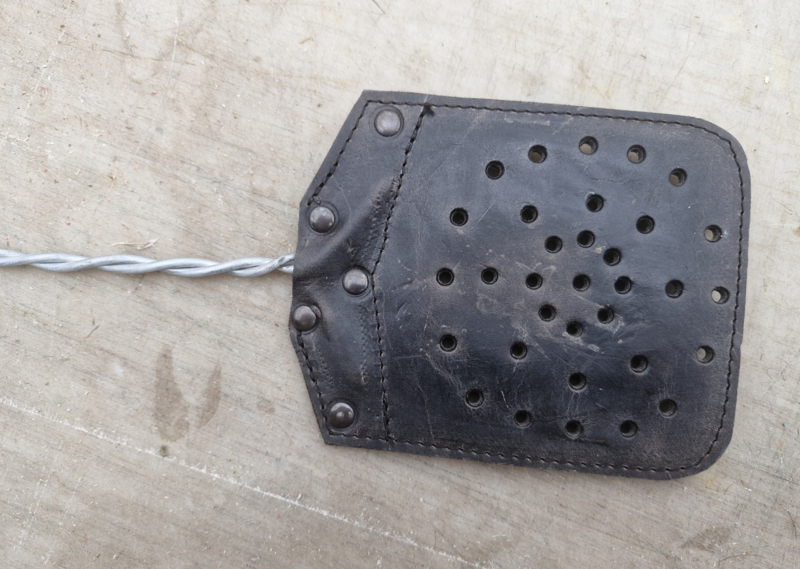 Bijna onverslijtbare vliegenmepper gemaakt van dik geolied leer en gevlochten draadstaal.