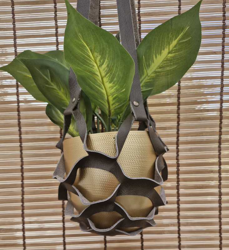 Plantenhanger in de vorm van een net gemaakt van leer. De lange banden waar het netje aan vast zit zijn ook van leer gemaakt en heeft een ring om het geheel op te hangen.